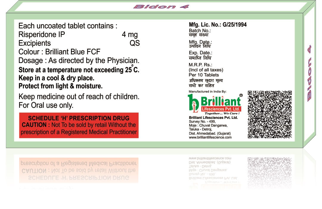 Schizophrenia is a mental disorder in which a person's thinking ability, feelings and behavior become abnormal. BIDON 4 Tablet helps restore the chemical imbalances in the brain that are responsible for such changes. It improves thoughts, behavior and enhances the quality of life.