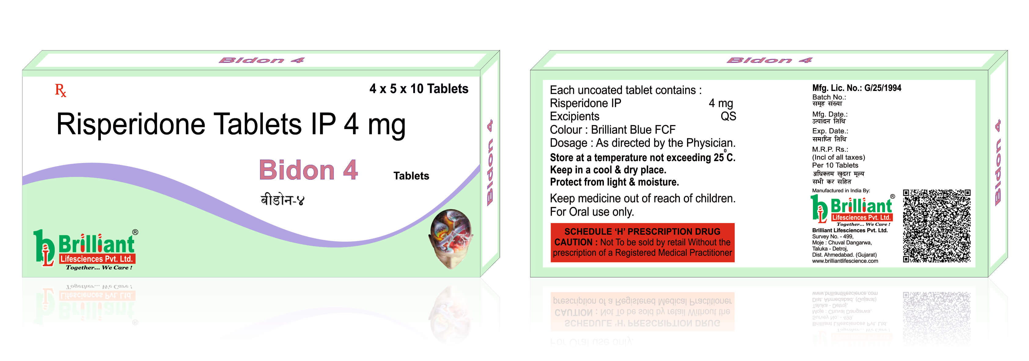 BIDON 4 Tablet is an atypical antipsychotic. It works by affecting the levels of chemical messengers (dopamine and serotonin) to improve mood, thoughts and behavior.