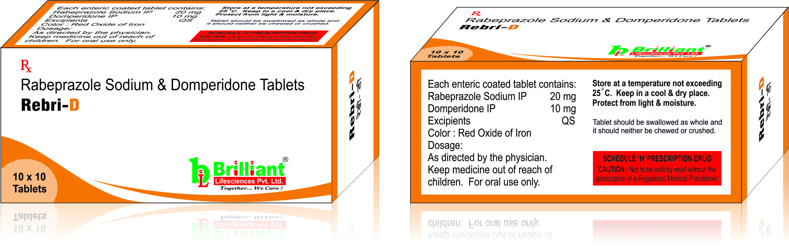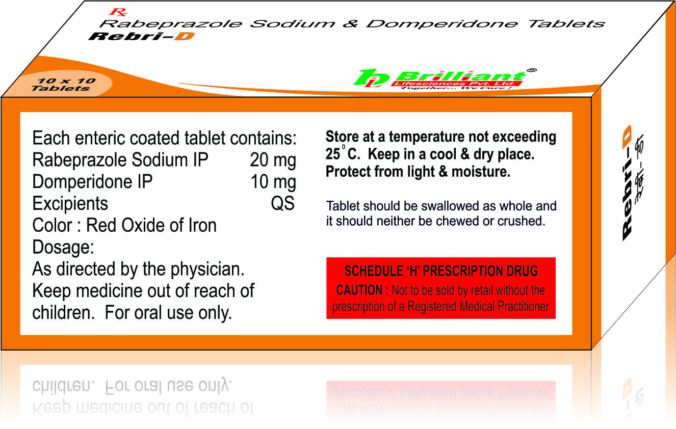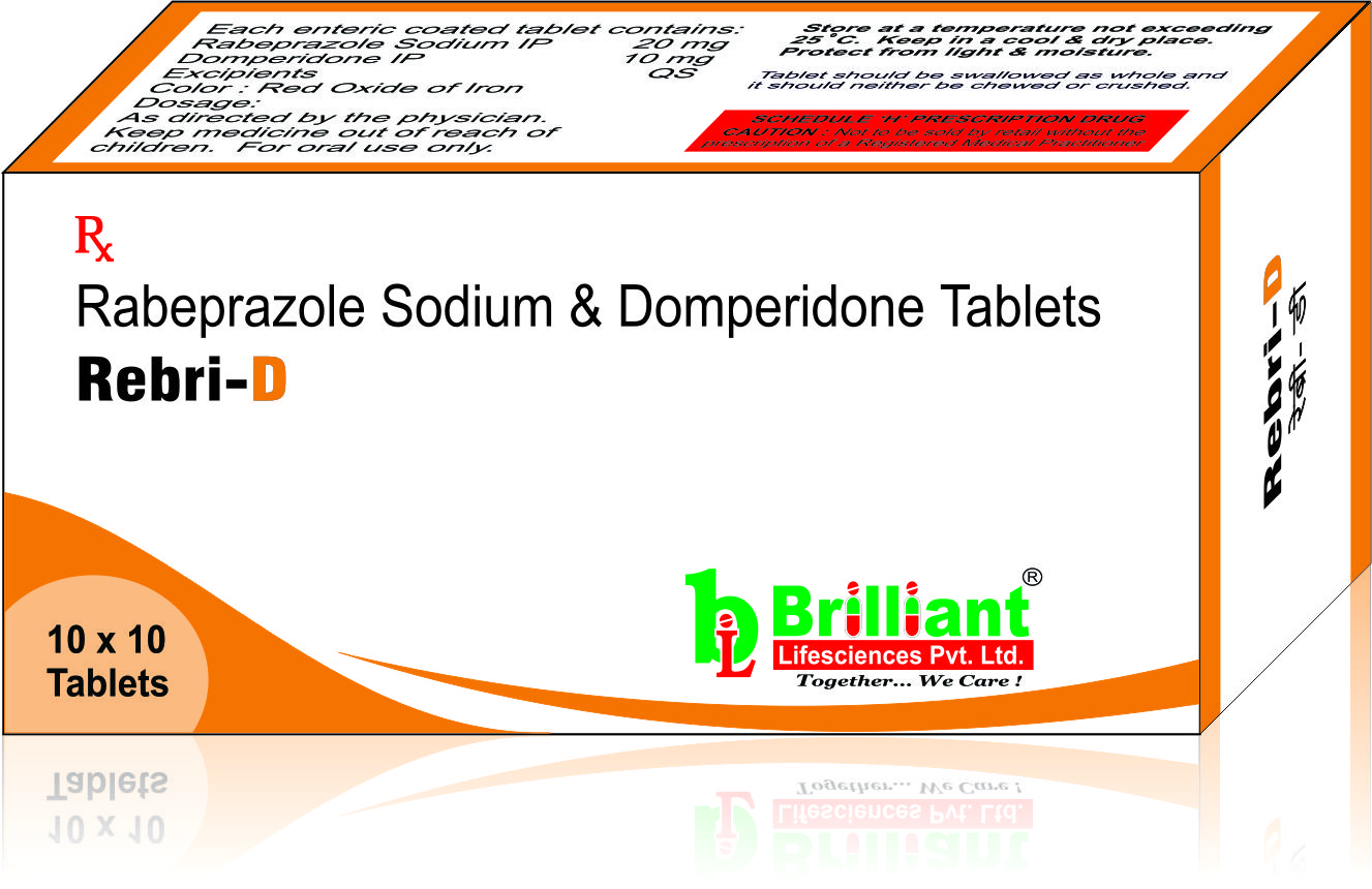 REBRI-D Tablet is a combination of two medicines: Domperidone and Rabeprazole. Domperidone is a prokinetic that works on the upper digestive tract to increase the movement of the stomach and intestines, allowing the food to move more easily through the stomach. Rabeprazole is a proton pump inhibitor (PPI) which works by reducing the amount of acid in the stomach, which helps in the relief of acid-related indigestion and heartburn.