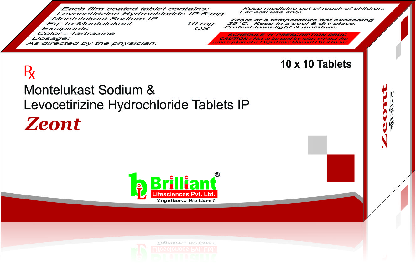 ZEONT Tablet is a combination of two medicines: Levocetirizine and Montelukast, which relieve sneezing and a runny nose due to allergies. Levocetirizine is an antihistamine that blocks a chemical messenger (histamine) responsible for runny nose, watery eyes, and sneezing. Montelukast is a leukotriene antagonist. It works by blocking another chemical messenger (leukotriene). This reduces inflammation (swelling) in the airways and nose, and improves symptoms.