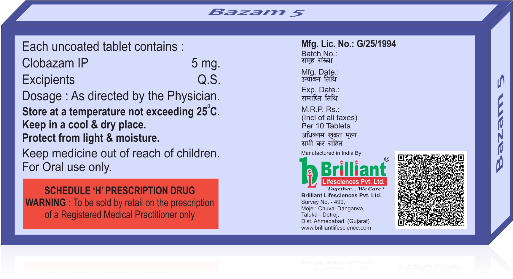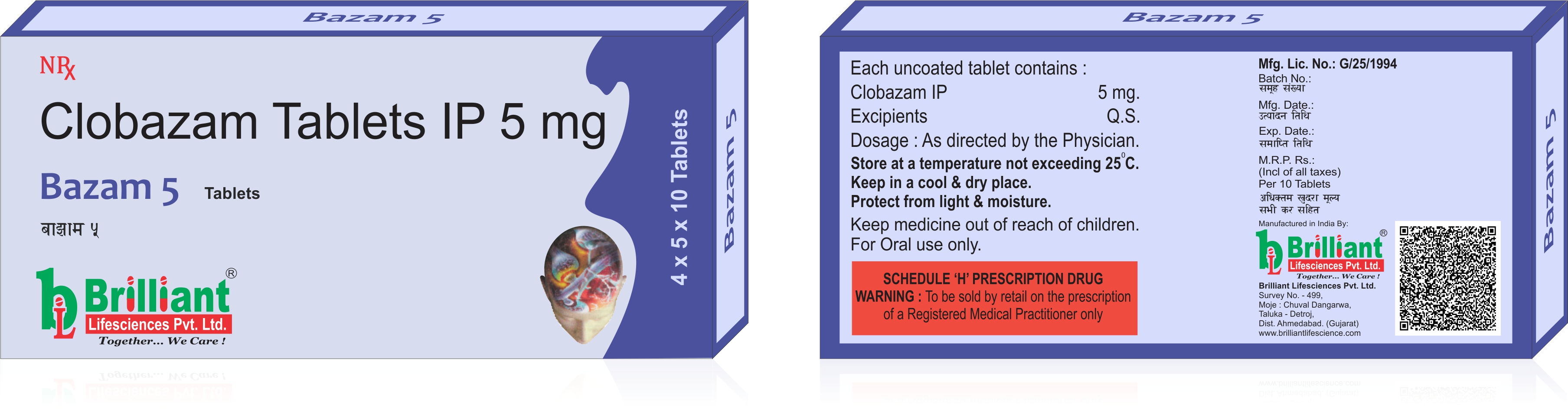 BAZAM 5 Tablet belongs to a class of medicines known as benzodiazepines. It is used to treat epilepsy (seizures) and severe anxiety. It works by suppressing the abnormal and excessive activity of the nerve cells in the brain.