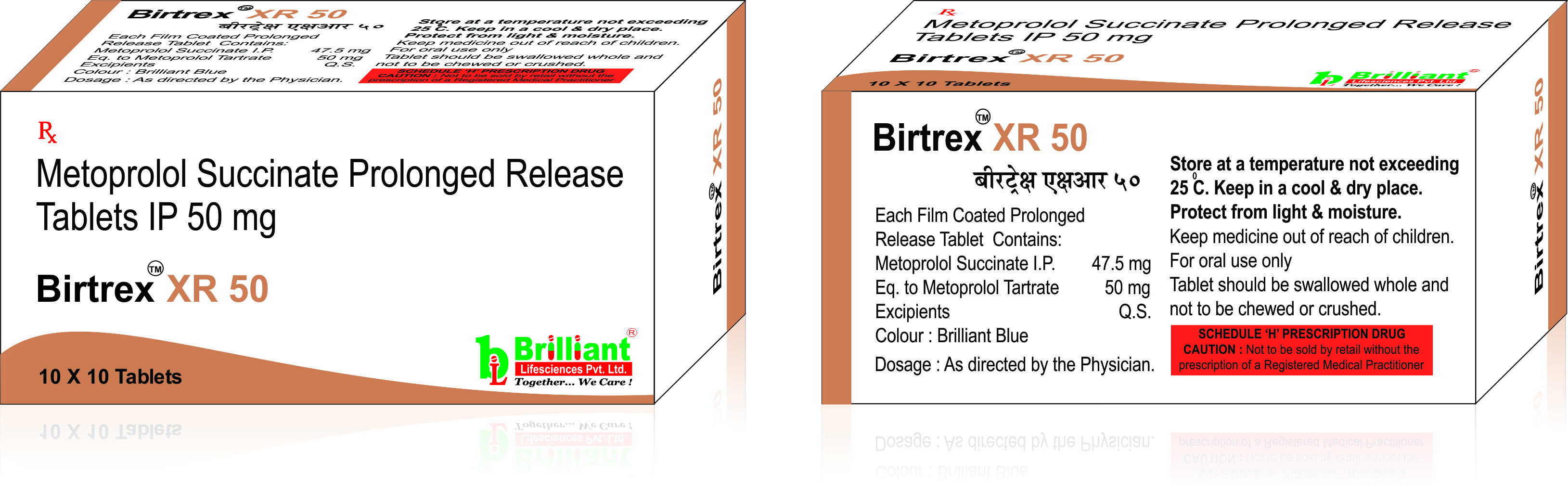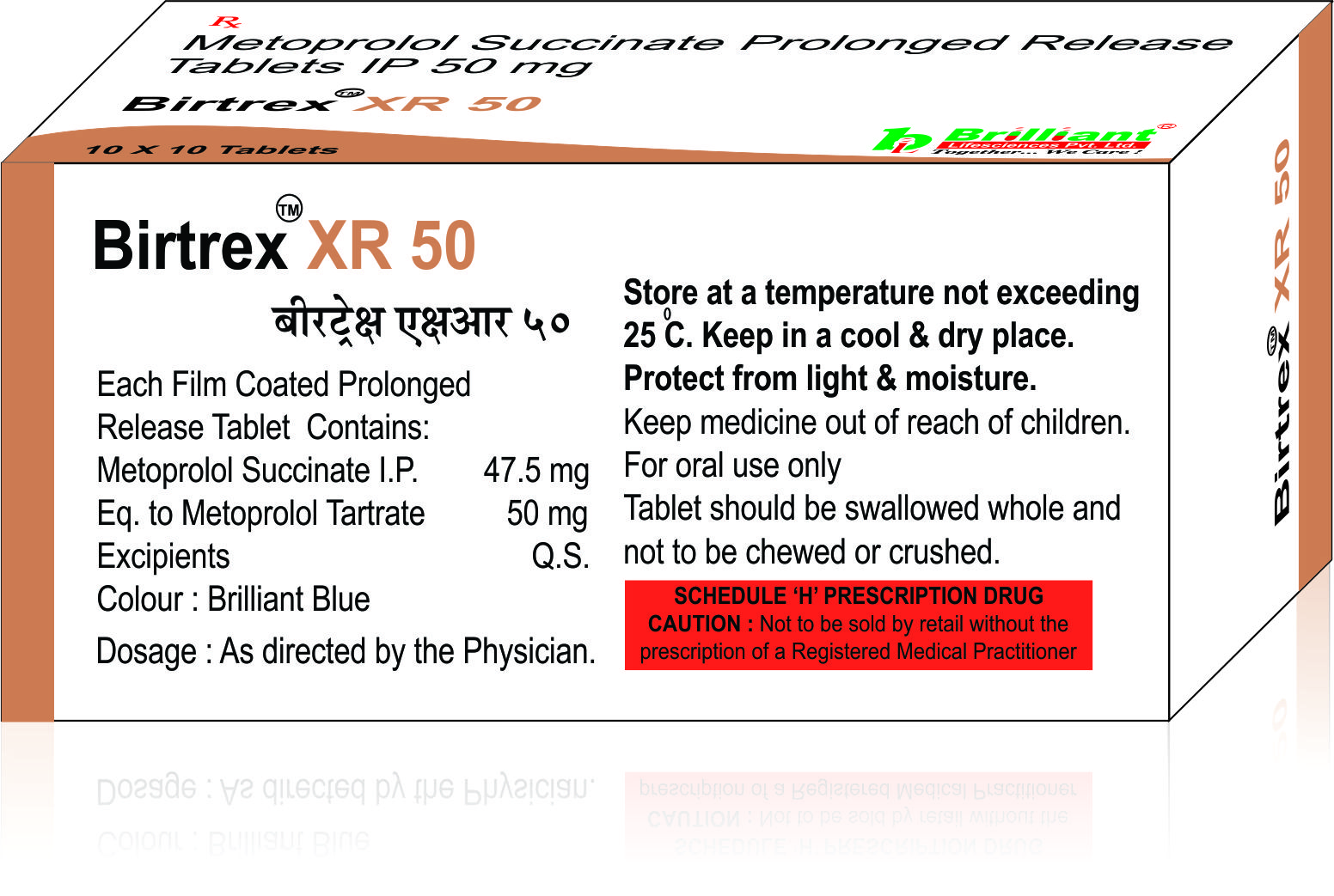 BIRTREX XR 50 Tablets belongs to a group of medicines called long-acting beta-blocker. BIRTREX XR 50 Tablets works by blocking the effects of some chemicals on your heart and blood vessels. It slows down your heart rate and helps it to beat with less force. This lowers your blood pressure and helps in reducing your risk of having a stroke, a heart attack, other heart problems, or kidney problems in the future. This medicine needs to be taken regularly to be effective, so keep taking it even if you feel well. Do not stop without talking to your doctor.