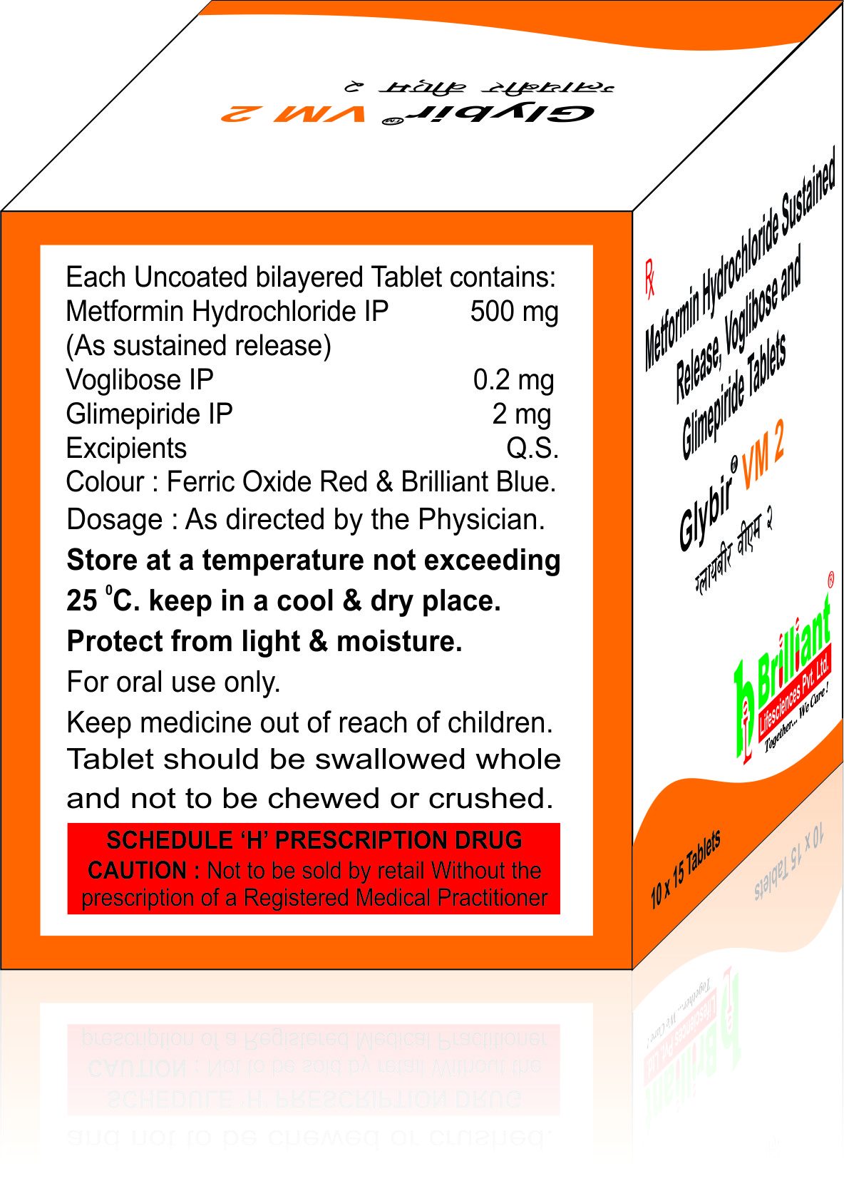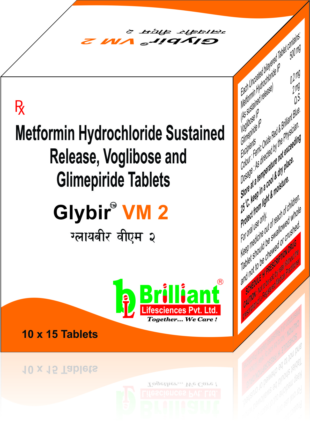 GLYBIR VM2 Tablet is a combination of three antidiabetic medicines: glimepiride, metformin, and voglibose. They work by different mechanisms to provide better control of blood sugar when single or dual therapy is not effective. Glimepiride is a sulfonylurea that works by increasing the amount of insulin released by the pancreas to lower the blood glucose. Metformin is a biguanide that lowers glucose production in the liver, delays glucose absorption from the intestines, and increases the body's sensitivity to insulin. Voglibose is an alpha-glucosidase inhibitor that prevents the breakdown of complex sugars into simple sugars such as glucose. This prevents the blood glucose levels from rising to very high levels after meals.