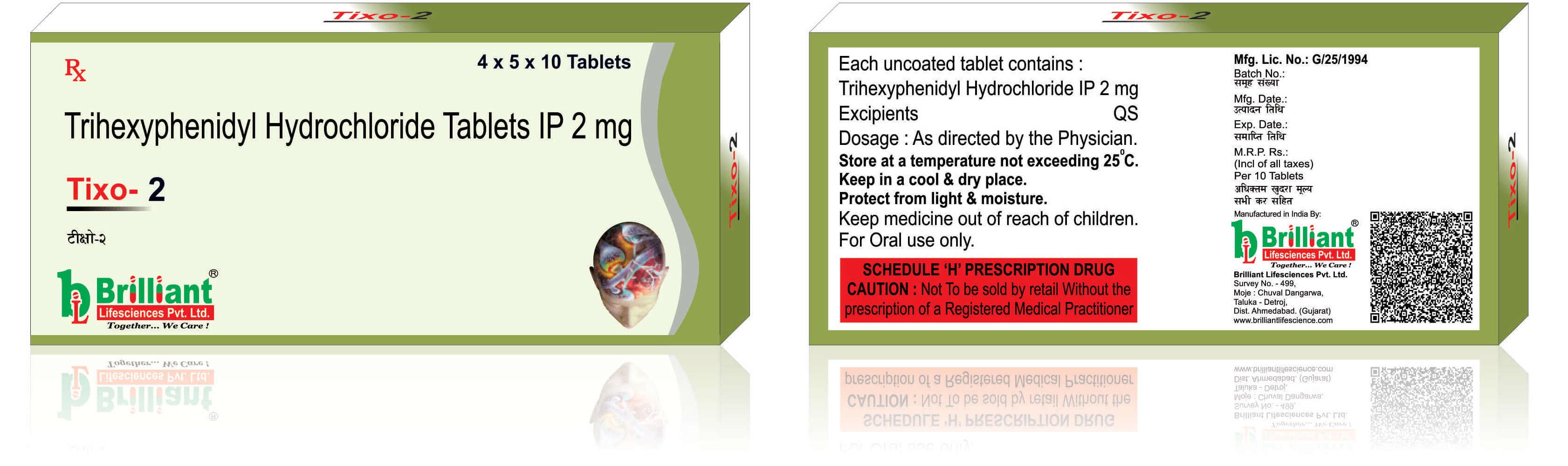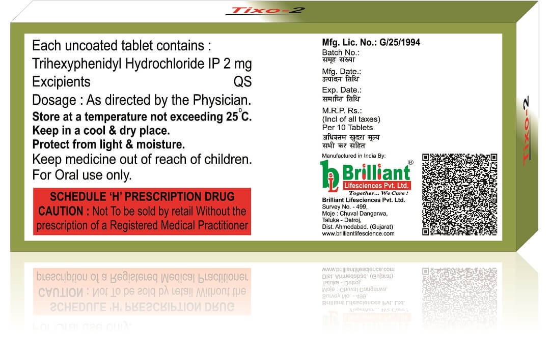 TIXO 2 Tablet is an anticholinergic medication. It works by decreasing the activity of a chemical messenger (acetylcholine) in the brain. This improves muscle control and reduces stiffness in Parkinson's disease.