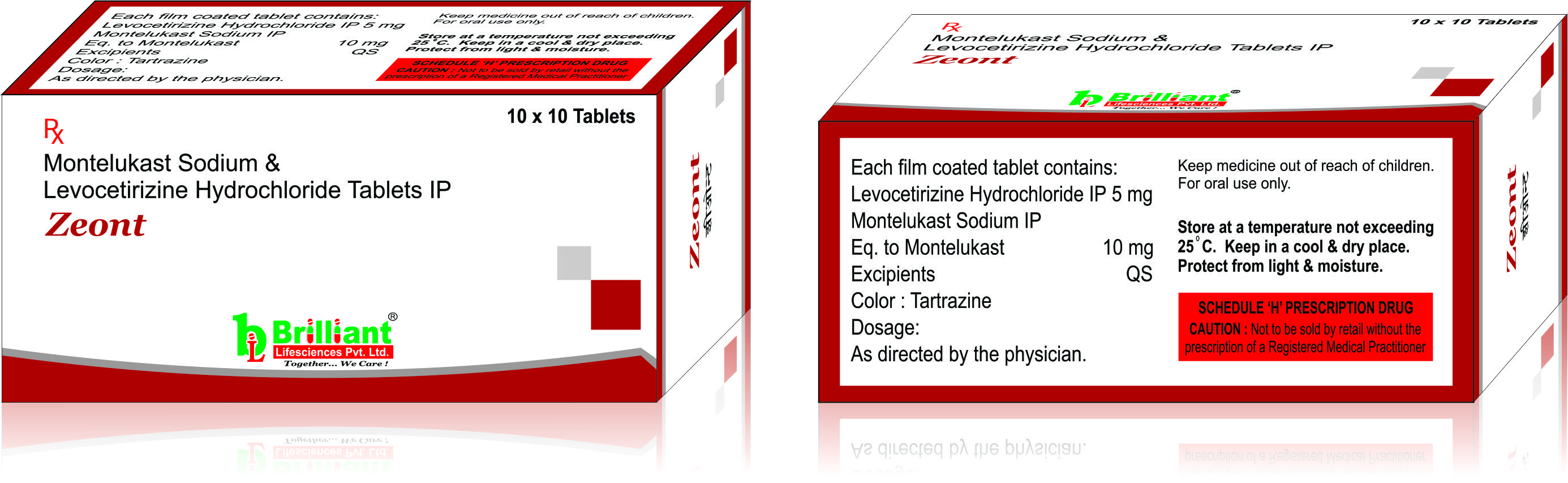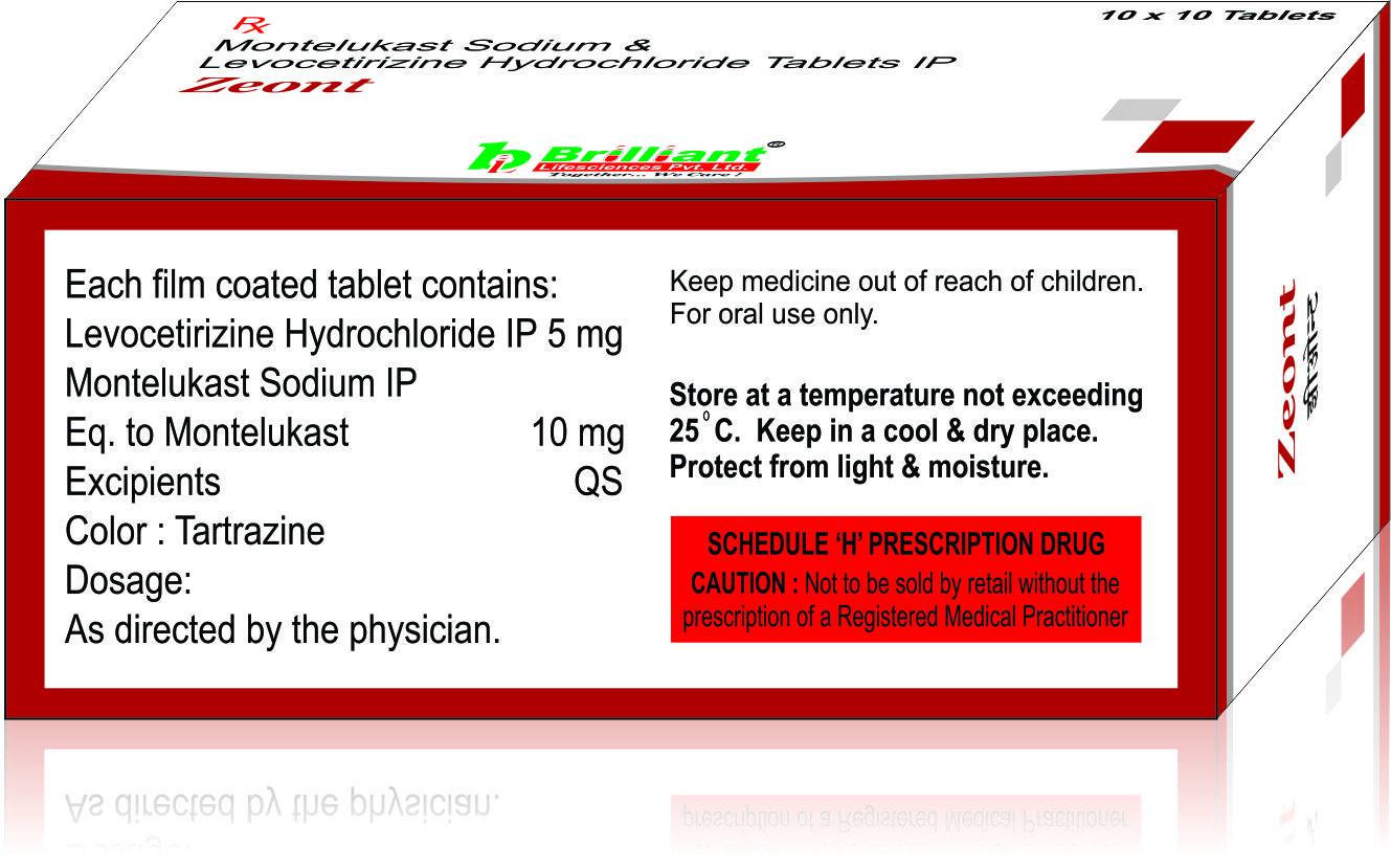 ZEONT Tablet is a combination of two medicines: Levocetirizine and Montelukast, which relieve sneezing and a runny nose due to allergies. Levocetirizine is an antihistamine that blocks a chemical messenger (histamine) responsible for runny nose, watery eyes, and sneezing. Montelukast is a leukotriene antagonist. It works by blocking another chemical messenger (leukotriene). This reduces inflammation (swelling) in the airways and nose, and improves symptoms.